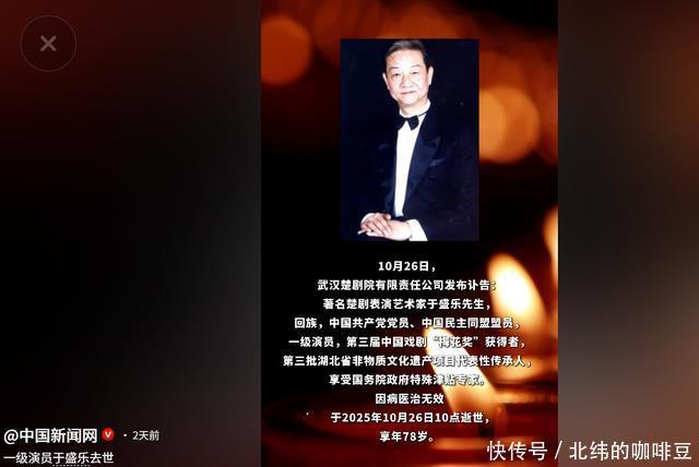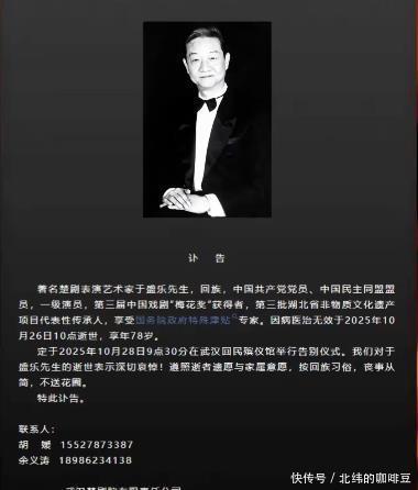 他就像块被命运错待的璞玉,有天赋却没遇着好机遇,被美貌困了大半辈子。最后安静离开,倒像是给这段满是无奈的人生,划了个不算潦草的句号。 楚剧艺术家 25号的遗憾还没散,26号武汉楚剧院就发了讣告——78岁的于盛乐先生走了。他是楚剧“盛”字辈的代表,一辈子都在跟楚剧打交道,他这一走,楚剧界等于少了根顶梁柱。
